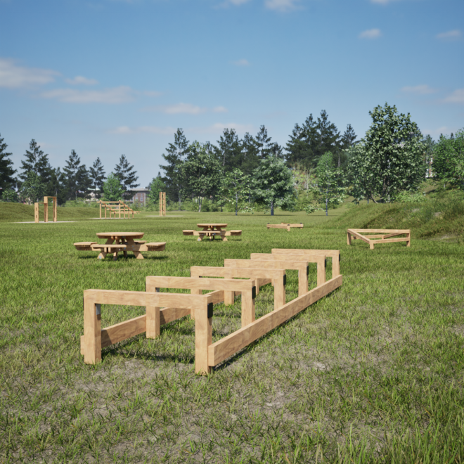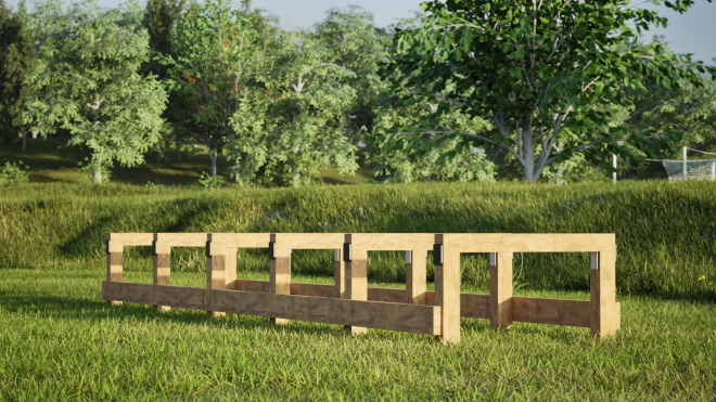 Šī iekārta ir izgatavota no kvalitatīvas priedes koksnes un pārstrādāta HDPE materiāla, kas nodrošina ilgmūžību un izturību pret laikapstākļiem, saglabājot dabisku estētiku un drošību lietošanā.