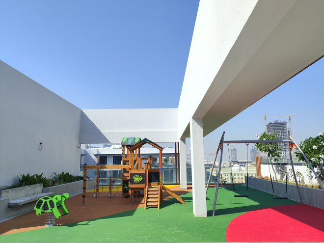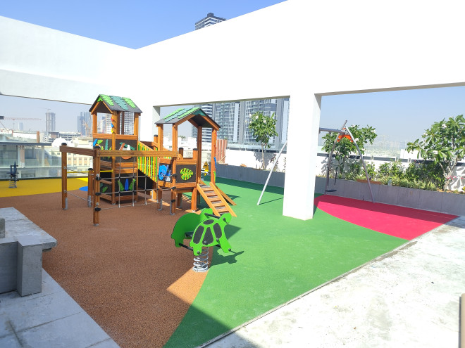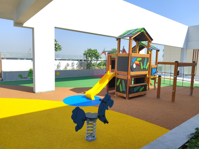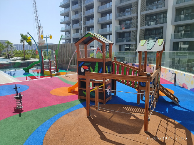 Rotaļu mājai ir piemērots augstums un platformas līmeņi, kas ir droši bērniem no 3 gadu vecuma. Aprīkojums atbilst drošības prasībām, nodrošinot kritiena virsmu un aizsargājošu drošības zonu, kas ļauj bērniem rotaļāties bez riska traumām. Konstrukcijas elementi ir izstrādāti tā, lai izturētu intensīvu lietošanu un nodrošinātu stabilitāti.
