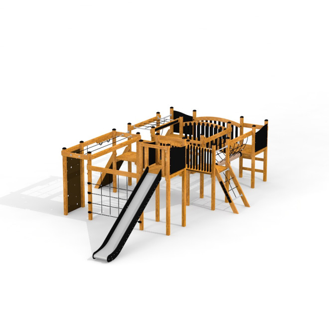 Rotaļu komplekss ir izgatavots no kvalitatīvas priedes koksnes, nerūsējošā un galvanizētā tērauda, kā arī no pārstrādāta HDPE un polipropilēna virvēm. Pretslīdējošais, ūdensizturīgais saplāksnis nodrošina stabilitāti un ilgmūžību, savukārt PE elementi papildina izturību un estētiku. Šāda materiālu kombinācija garantē ilgu ekspluatāciju un uzticamu drošību.